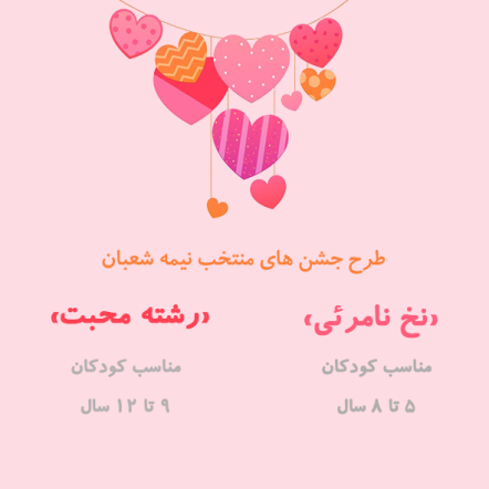 مجموعه بازی های جشن ها مناسبت: نیمه شعبان نوباوه: 4 تا 7 سال نوخوان: 7 تا 9 سال نونهال: 9 تا 12 سال گروه فرهنگی: تمشک